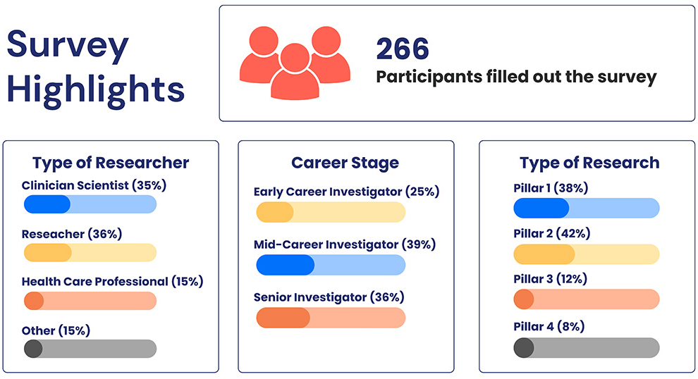 Additionally, ICRH conducted an online survey to gain deeper insights and identify emerging research priorities and gaps. 266 participants from the research community, health care professionals and other groups provided feedback. Participants surveyed represent a diverse group across disciplines and career stages.