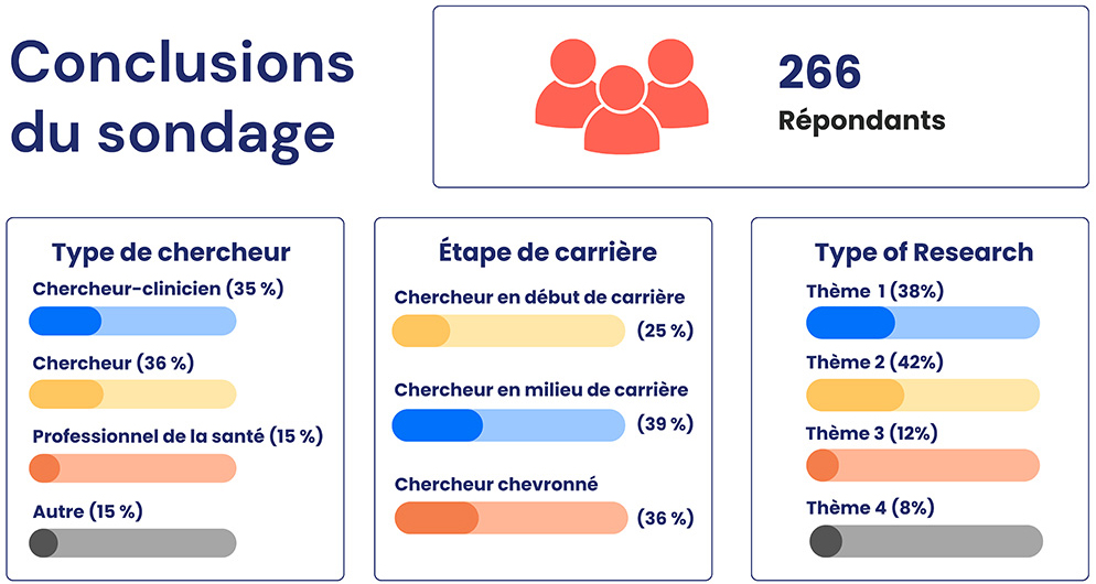 En outre, l'ISCR a mené un sondage en ligne afin de mieux connaître les lacunes en recherche et définir les nouvelles priorités en conséquence. Parmi les répondants (266 en tout) figuraient entre autres des membres du milieu de la recherche et des professionnels de la santé, qui représentaient un large éventail de disciplines et d'étape de carrière.