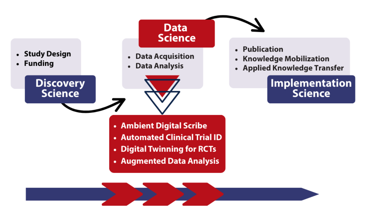 The figure below illustrates how AI integration can accelerate the entire research-to-impact pipeline, from discovery through data acquisition and analysis to real-world implementation. Emerging tools such as ambient digital scribes, automated trial matching, digital twinning for randomized clinical trials (RCTs) and AI-augmented analytics represent some of the most promising technologies driving this transformation. These tools will help streamline implementation by facilitating publication, knowledge mobilization, and applied knowledge transfer.