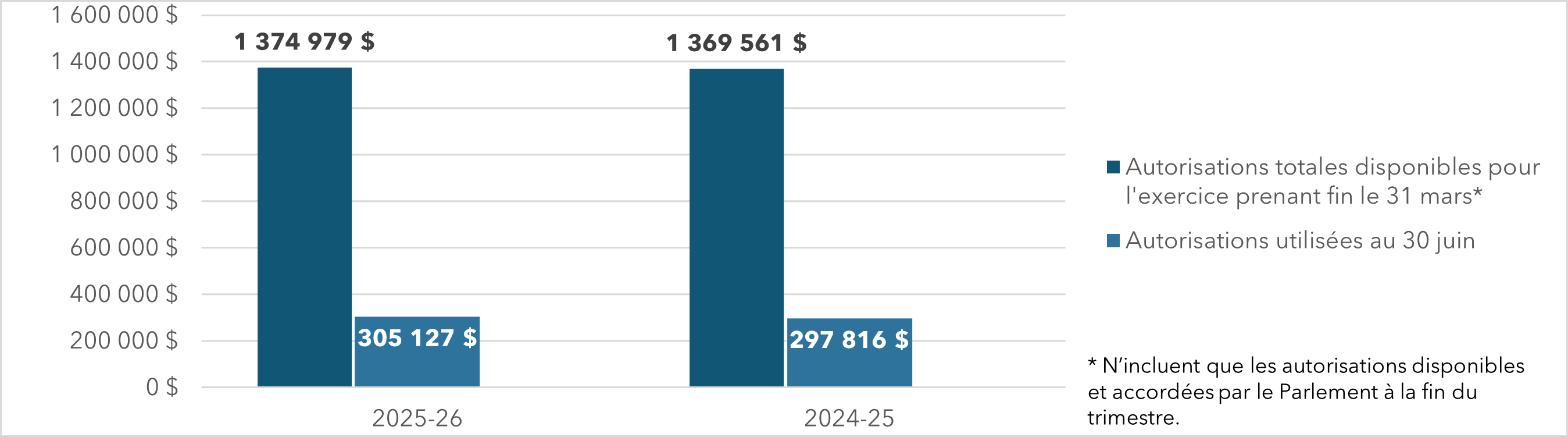 | Dépenses | Dépenses prévues pour l'exercice se terminant le 31 mars 2026Note en bas de page * | Dépenses durant le trimestre terminé le 30 juin 2025 | Cumul des crédits utilisés à la fin du trimestre |