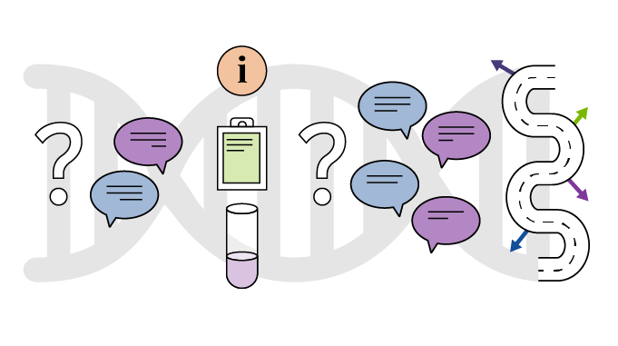 Questions soulevées, discussion avec l'équipe soignante qui comprend un conseiller en génétique, collecte d'informations, aide à l'analyse des informations, soutien du conseiller en génétique pour aider une personne ou les membres de sa famille à faire les choix qui leur conviennent dans leur parcours de soins.